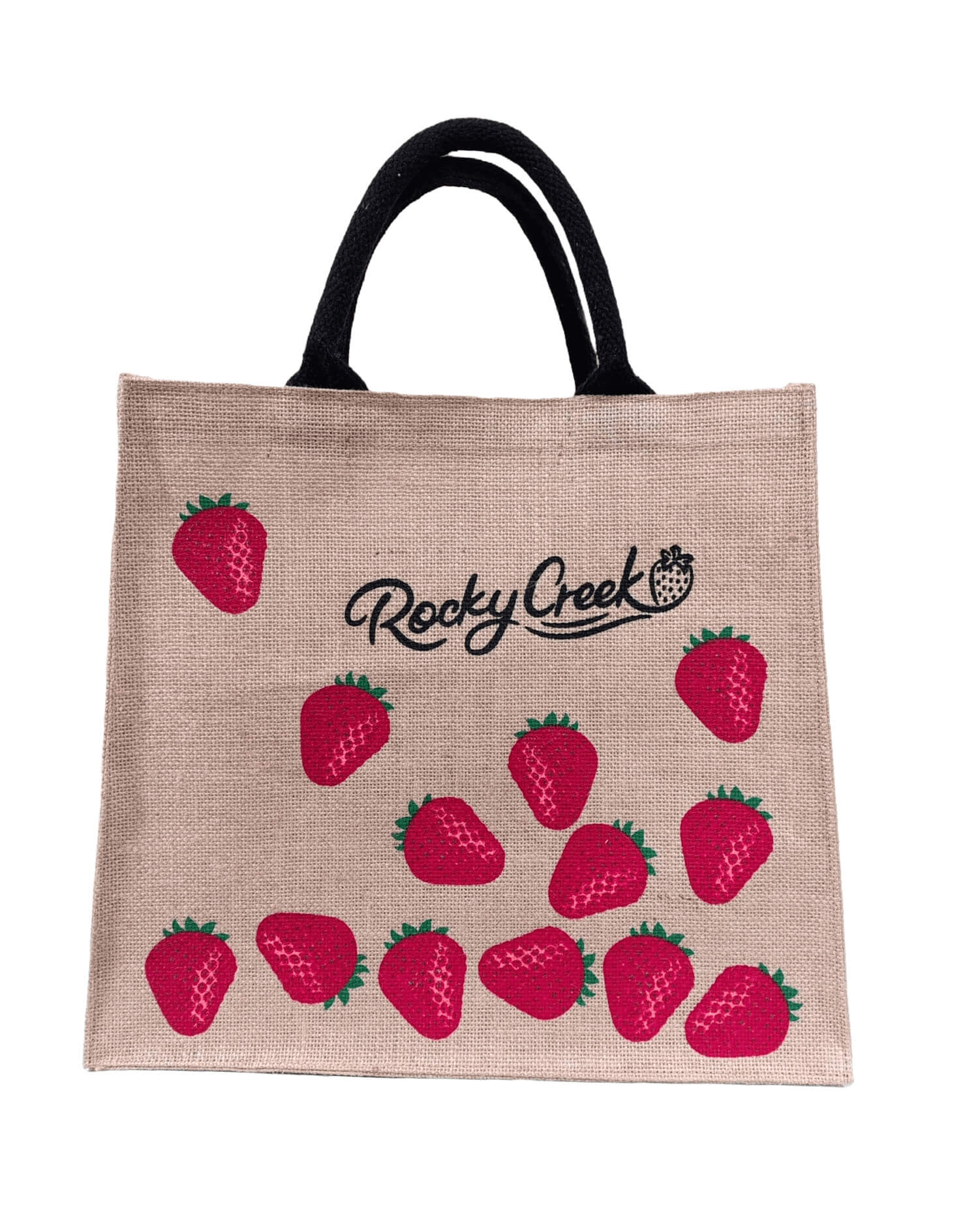 Playful, practical, and proudly designed for Rocky Creek, this strawberry-themed jute bag is a vibrant choice for pick-your-own farms, roadside stalls, and local grocers. The scattered berry print and hand-drawn logo bring a charming, rustic feel that appeals to both locals and tourists alike. Its generous size and structured base make it perfect for holding fresh produce, baked goods, or farm shop gifts. Made from sturdy natural jute with comfortable cotton handles, it’s as durable as it is eye-catching. Like all GX Bags, every detail can be customised—your farm name, colours, artwork, and more—so your brand stands out wherever the bag goes.