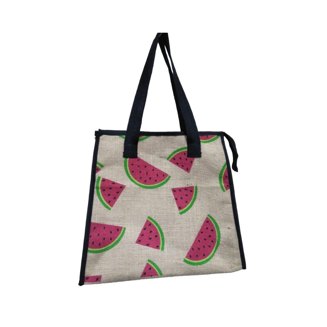 Our versatile Watermelon Slices Cooler Bags are designed to keep your items cold and fresh, featuring a secure zip closure and an internal lining for optimal insulation. Made from durable jute material, these bags are ideal for businesses looking to offer a practical and stylish product to their customers. Each carton contains 40 bags with a premix of 5 different designs, which are updated from time to time to offer fresh and seasonal themes. As part of our in-stock range, these bags are available for immediate purchase, providing a convenient and eco-friendly solution for various uses.
